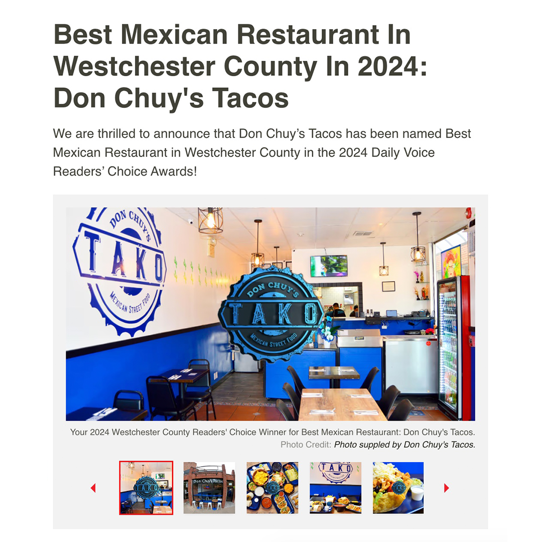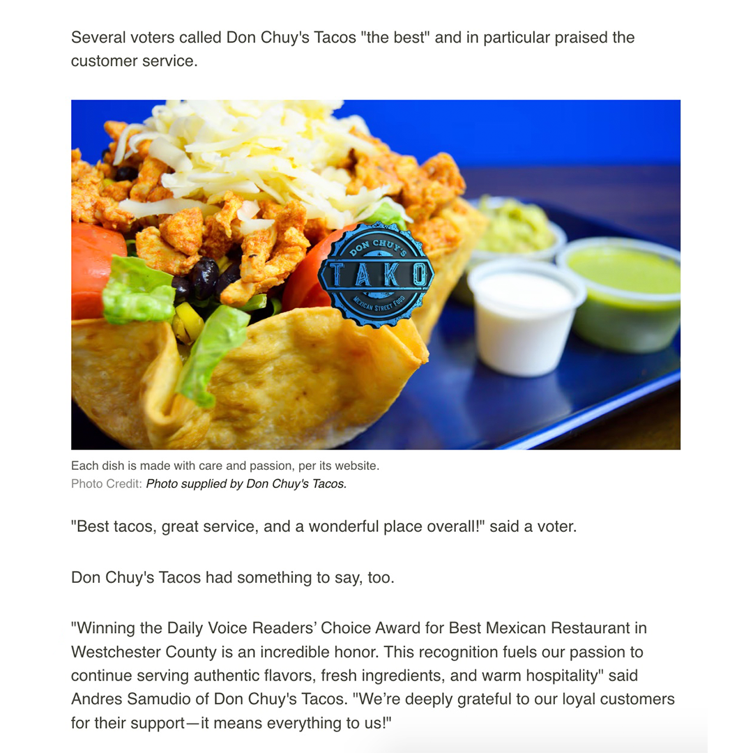 We’ve got some exciting news to share with all of our amazing customers – Don Chuy’s Tako has won the Daily Voice Readers’ Choice Award for Best Mexican Restaurant in Westchester County!